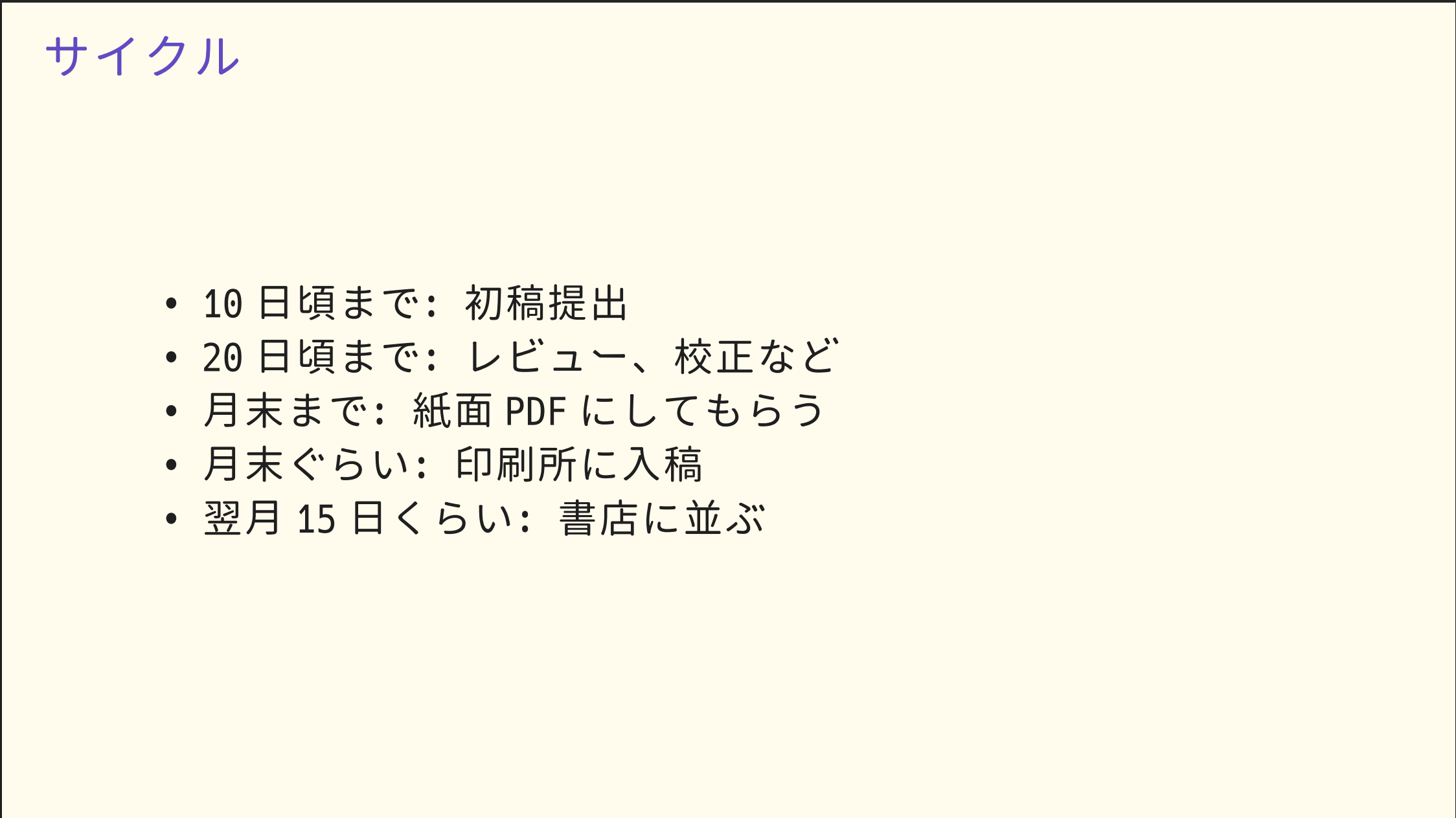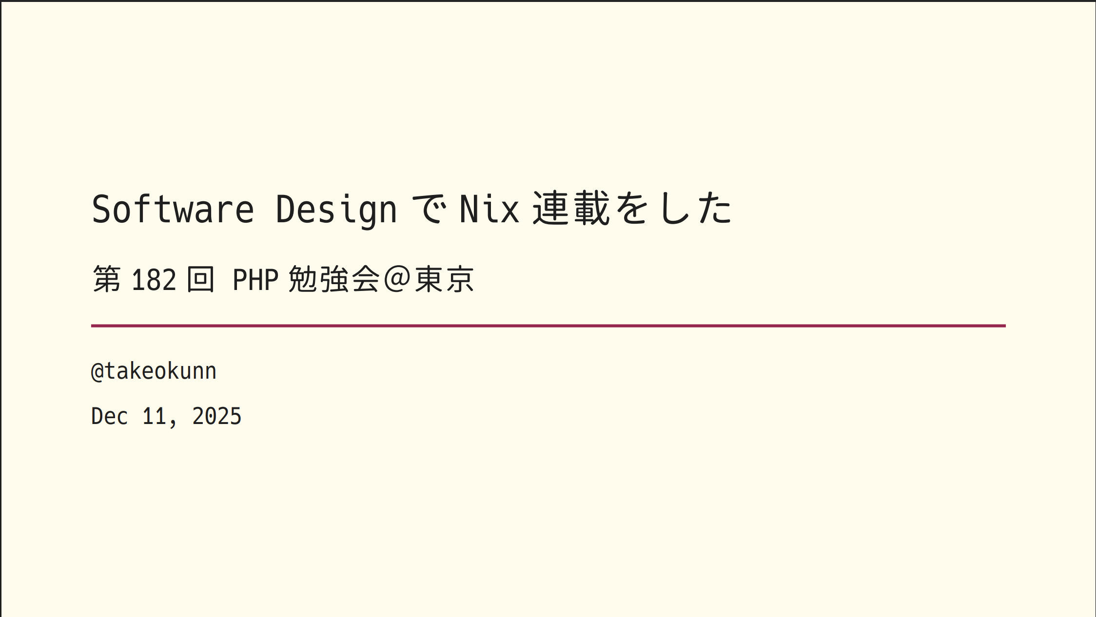 「Software DesignでNix連載しました」というスライドを作って登壇してみた。 特に問題なく登壇できたので今後も積極的に使っていきたい。