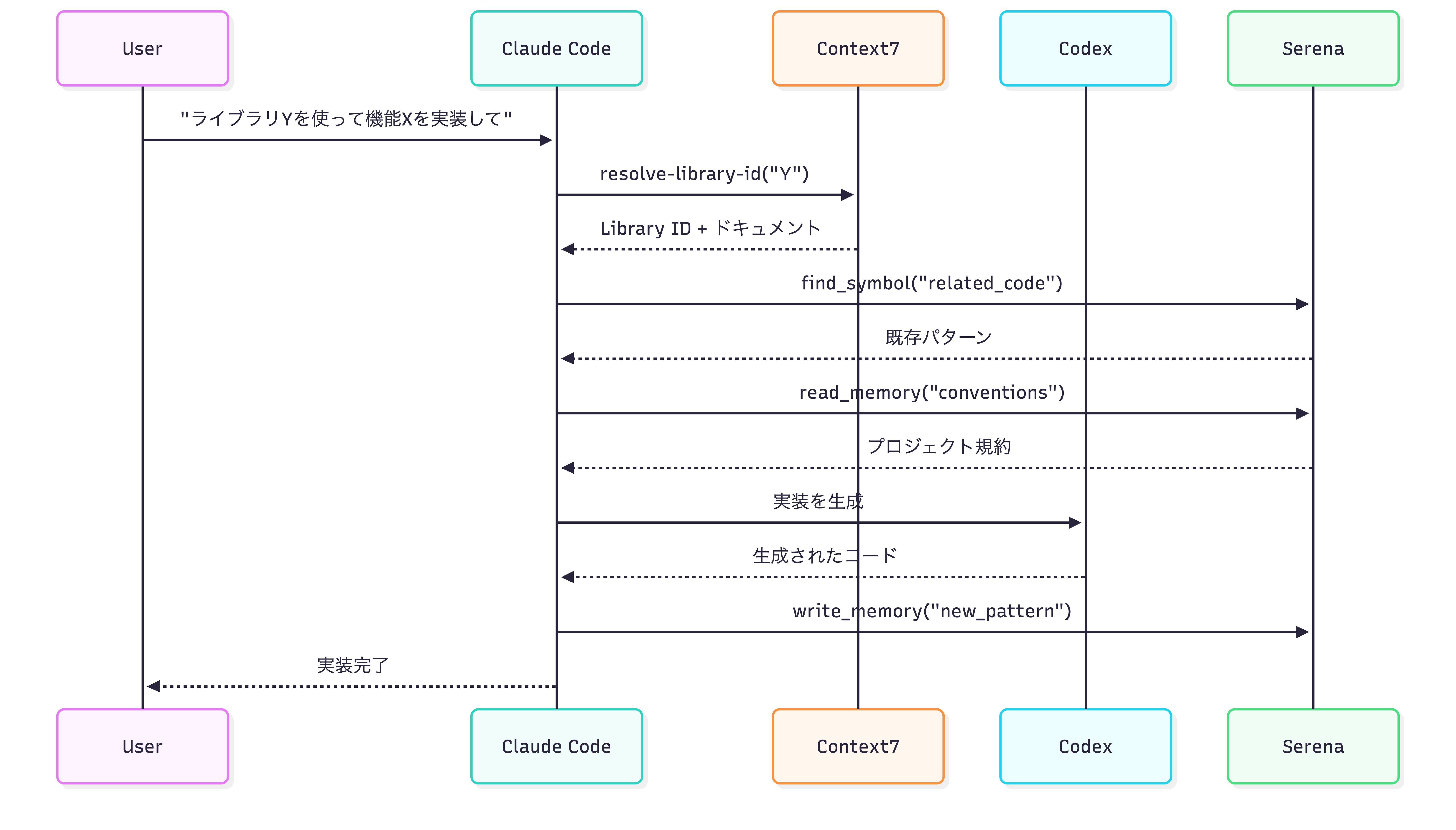 3つのMCP Serverは独立して動くのではなく、ワークフローの各フェーズで連携します。次のシーケンス図は、ユーザーからの実装依頼が完了するまでの流れを示しています。