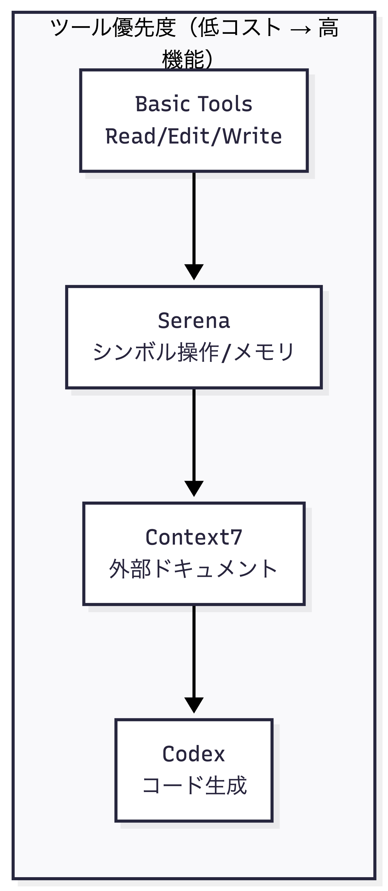 この優先度には理由があります。Priority 1のBasic Tools(Read/Edit/Write)はもっとも軽量で、単純なファイル操作には十分です。Priority 2のSerenaは、シンボル単位の操作でトークンを節約しながらコードを探索・編集できます。Priority 3のContext7は、外部ライブラリの最新ドキュメントが必要な場合にのみ使用します。Priority 4のCodexは、複雑なコード生成タスクに限定して使用し、調査や分析には使いません。