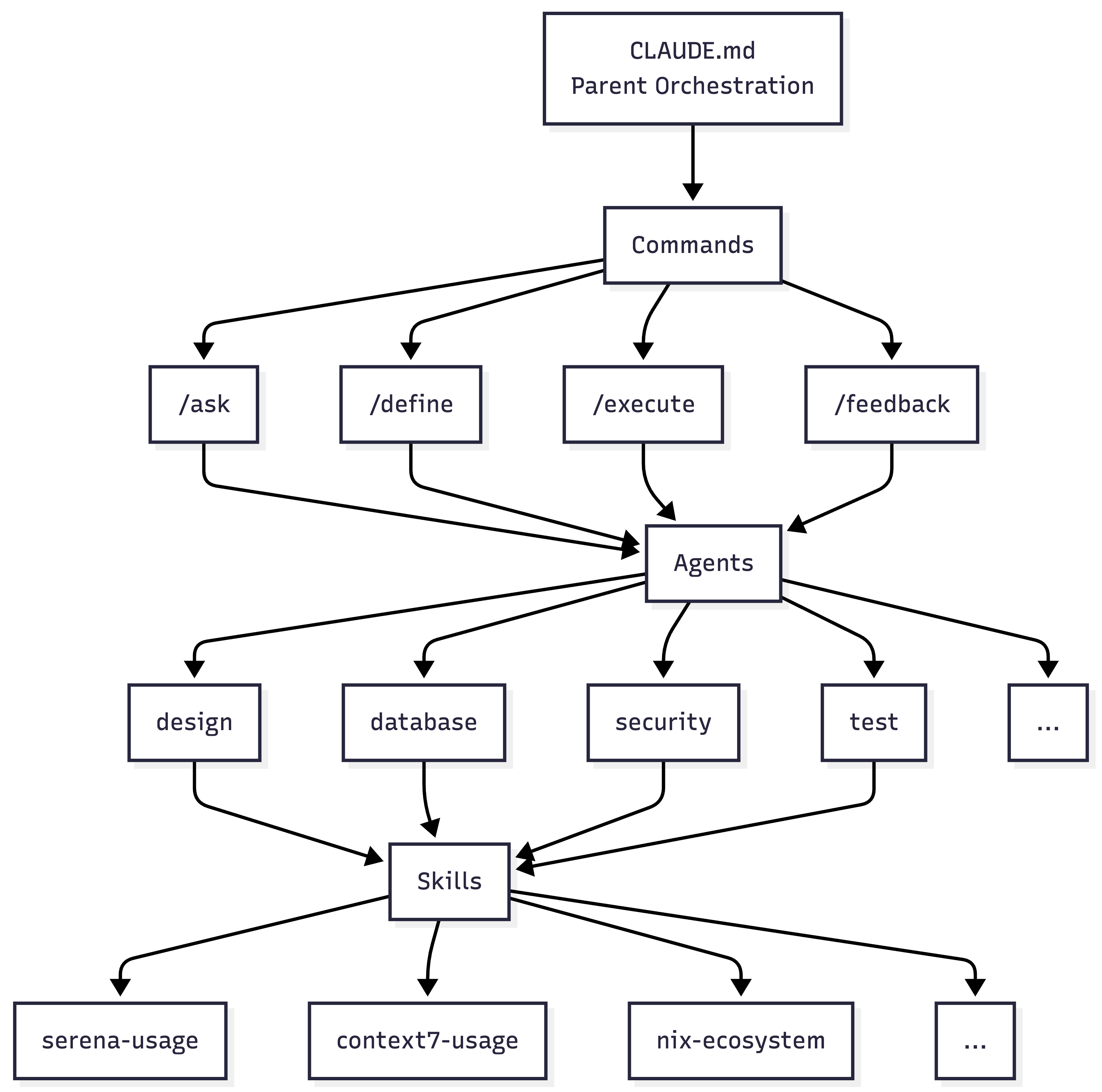 各階層の役割を整理します。CLAUDE.mdは親オーケストレーターとして方針決定と委譲を担います。Commandsはユーザーインターフェースとして特定タスクの起点となります。Agentsはdesign、security、testなど専門領域のエキスパートとして機能します。Skillsはnix-ecosystem、serena-usageなどドメイン知識ベースを提供します。